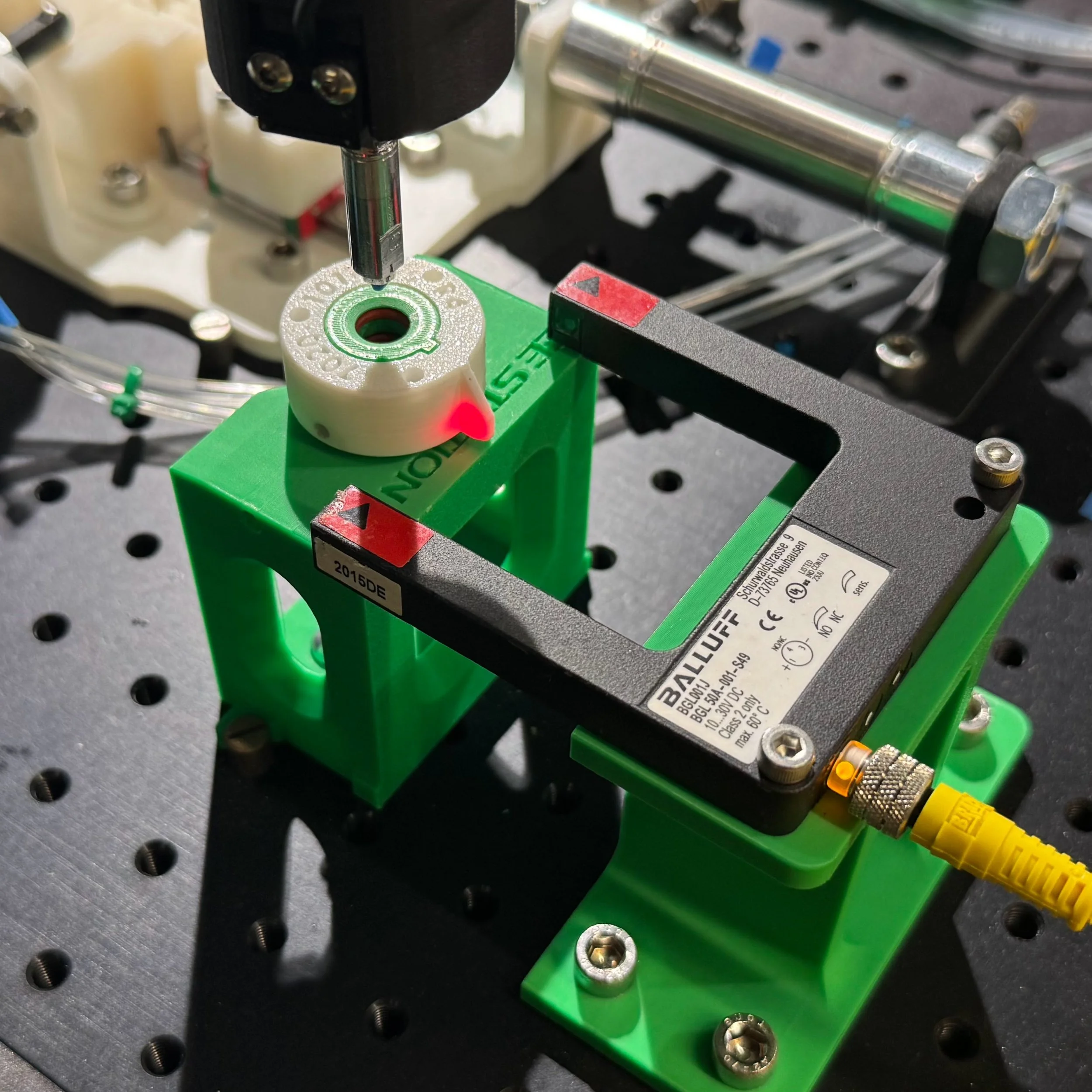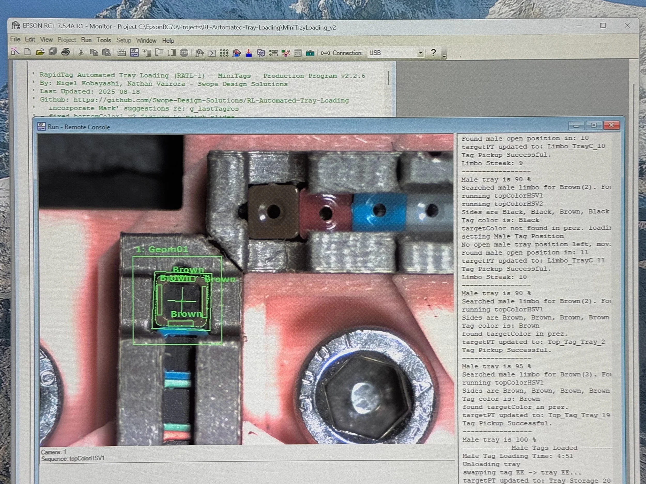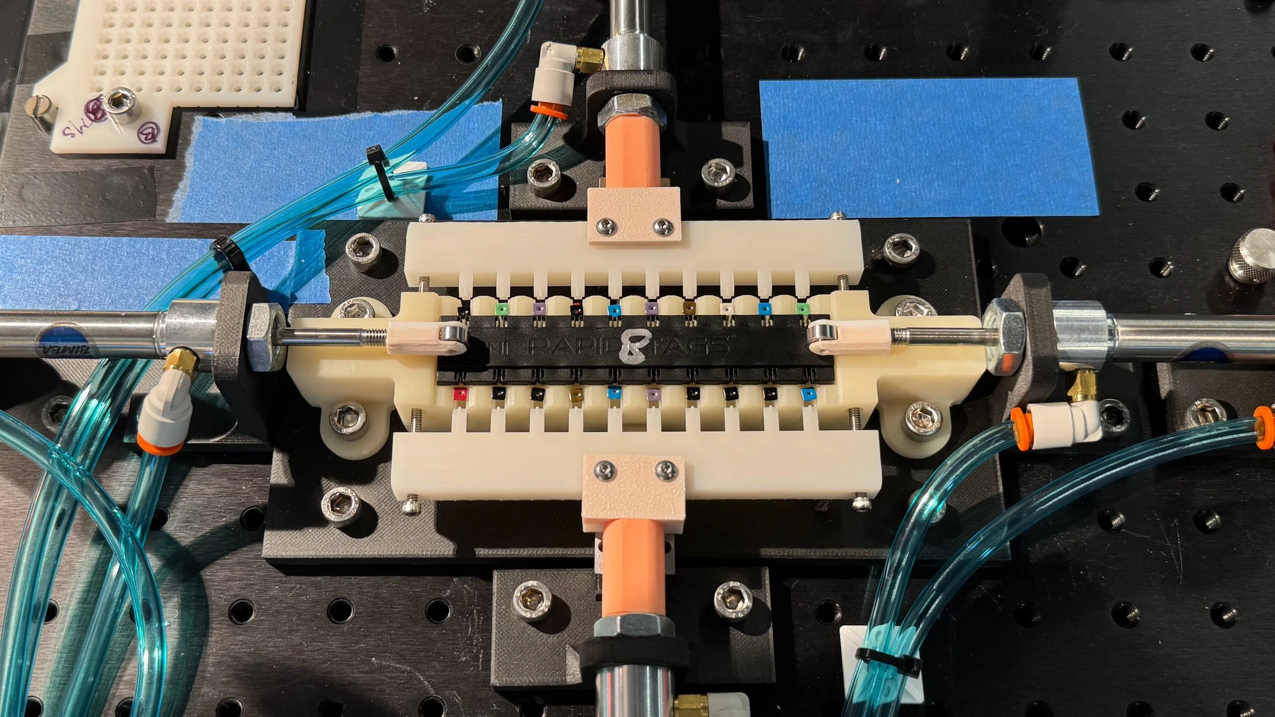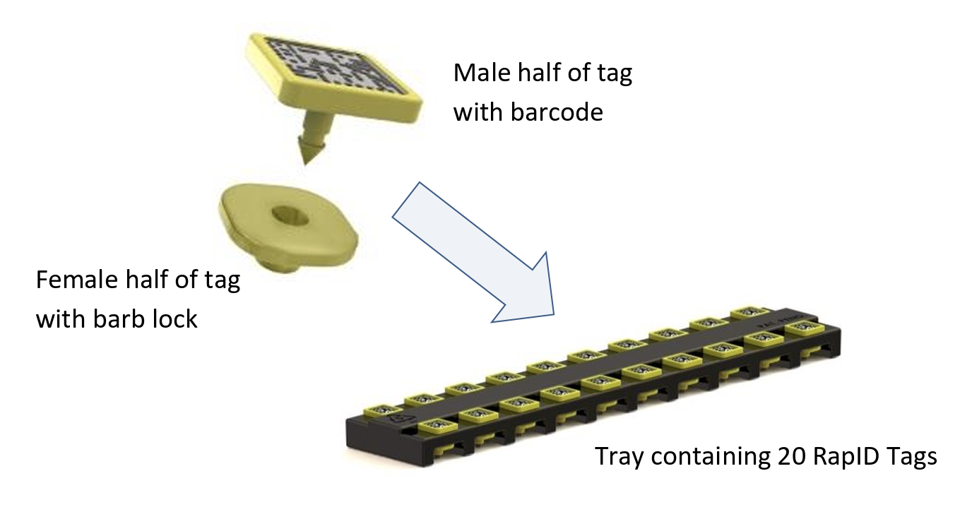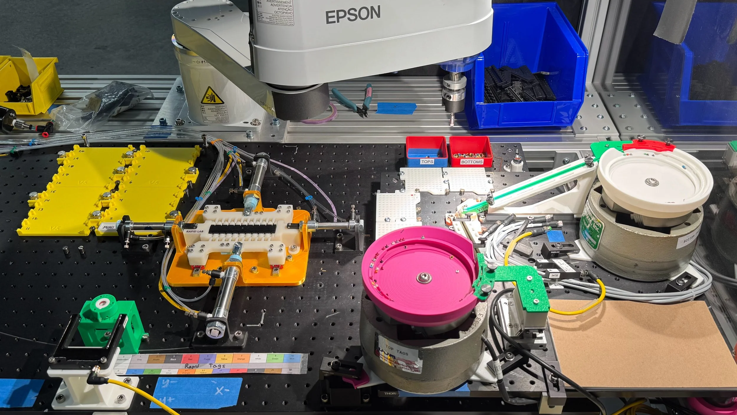 The product is composed of a carrier tray containing 20 small, multicolored tags. Each tag is either 3mm or 5mm across and includes a top (male) half and bottom (female) half, so each carrier tray contains a total of 40 parts. The tag parts must be loaded into the tray in a specific orientation, and the colors must be arranged in a specific pattern (unless parts are of a single color). A vision system identifies the color and location of tags to be loaded into the carrier tray. A high-speed SCARA robot performs the necessary pick-and-place operations, switching between end effectors as needed.