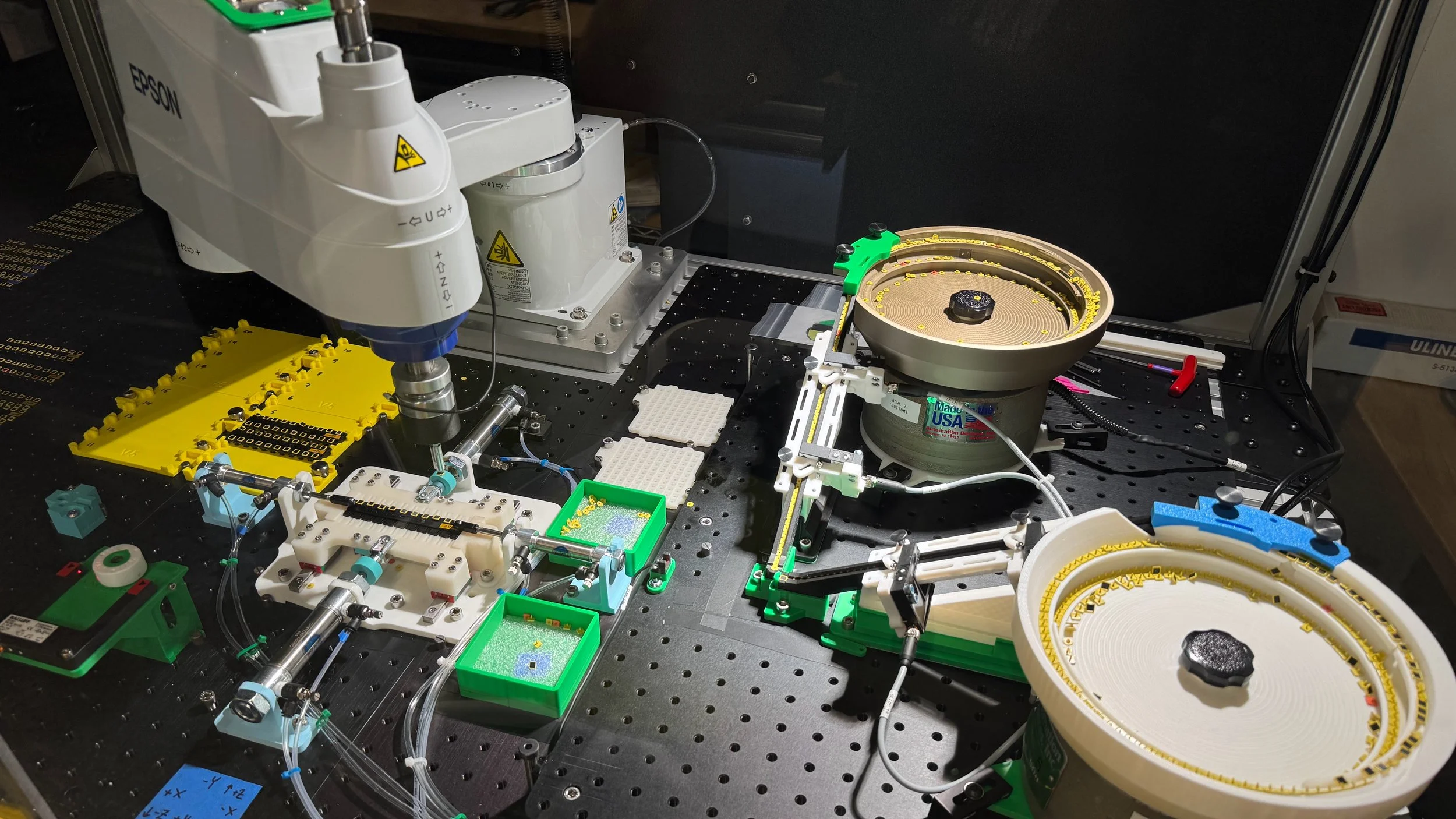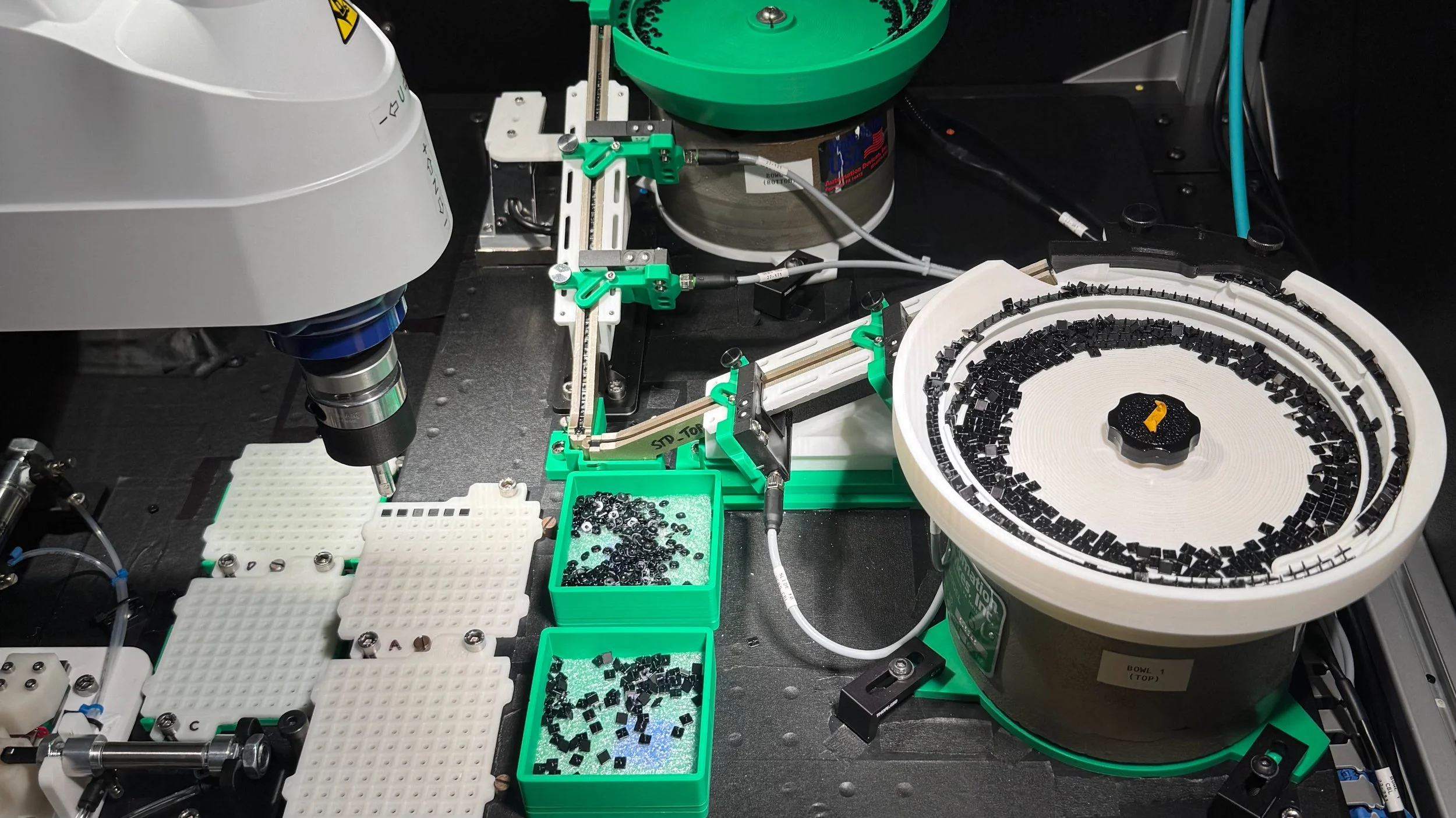 Automation workflow: Empty carrier trays are loaded into tray stages. Loose tag parts are loaded into two vibratory bowls (top tag parts in one bowl, bottom tag parts in the other). The automation program is initiated, and the bowls vibrate, causing the tag parts to tumble into the required orientation as they travel up a spiral ramp. The parts exit the bowl and slide down a ramp. As the slides fill with tag parts, the SCARA robot equips a specialized end effector and loads an empty carrier tray into the loading station. The robot switches to an end effector equipped with a tiny vacuum cup and loads bottom tag parts into the side loaders (part of the loading station). When the side loaders are full, pneumatic actuators press the bottom tag parts into the carrier tray. Top tag parts are then loaded directly into the carrier tray. When the tray is full, the robot switches end effectors, replaces the full tray with an empty one, and the process repeats until all carrier trays are full.